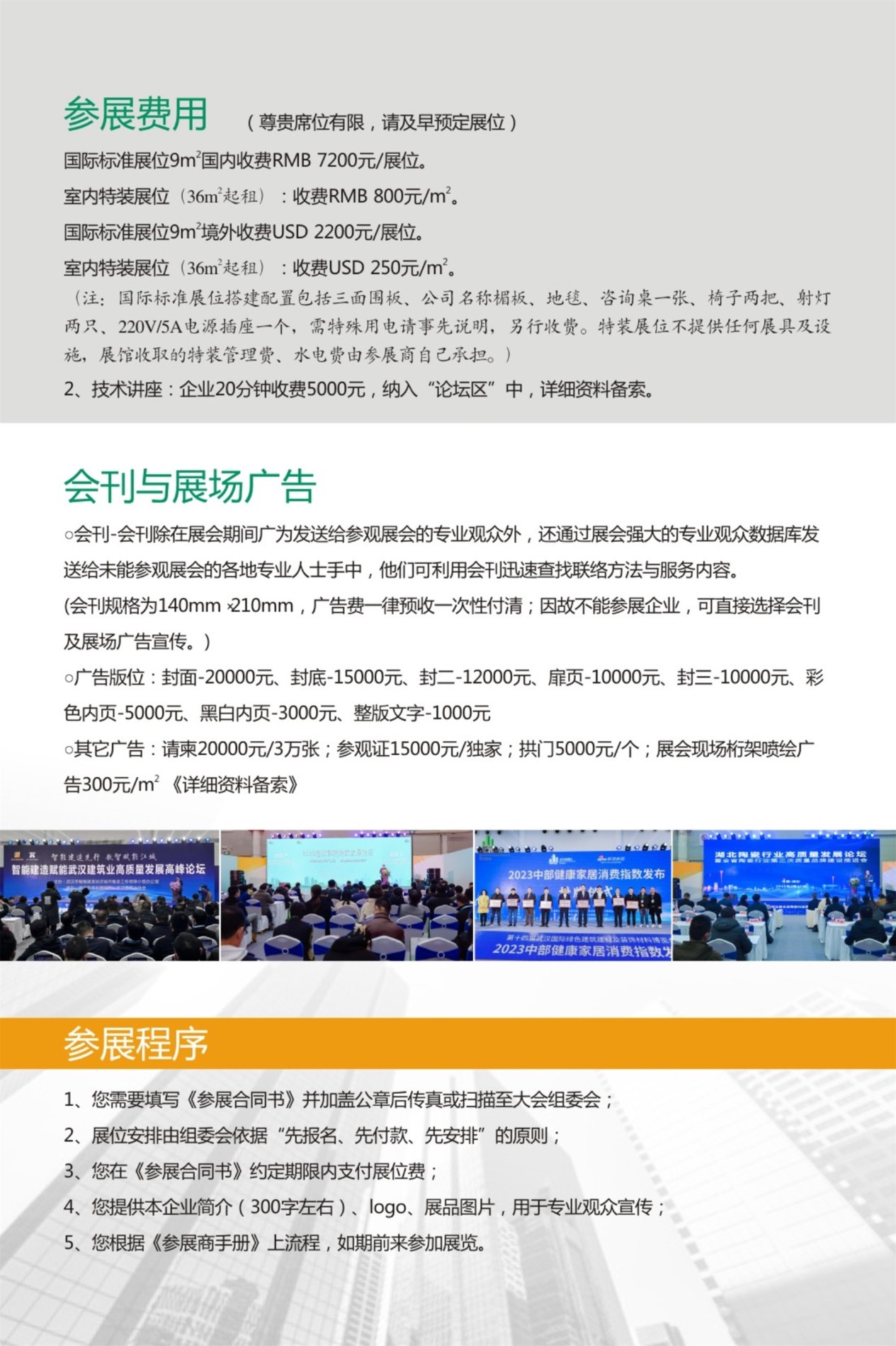 宣传推广。2024武汉建博会还将在中华建设、中国建材装饰网、预制建筑网、中华门窗网、武汉建设信息网等专业网刊以及展会、协会自媒体,本地武汉晚报、楚天都市报等主流传媒上发布会讯或刊登广告,篇幅达一千余,全面扩大、提升本届展会影响力。同时,在湖北各地建材市场、全国各地同类展会进行全方位地推。