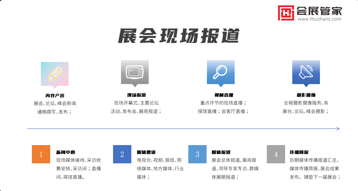 “会展管家——国内专业会展行业媒体服务商,会展管家主要给展会主办方、会议主办方、品牌参展企业提供媒体邀约、媒体采访、媒体发稿服务,给客户提供权威的媒体服务,会展管家建立了涵盖全国几乎所有一手媒体资源,包含官方媒体、各大门户网站、视频媒体、垂直行业媒体、自媒体、视频直播、图文直播等等,目前已经服务了200多个品牌展会论坛主办方,1500余家大型品牌企业,拥有专业的全案媒体服务经验