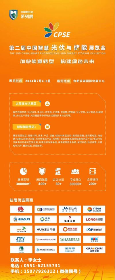 第二届中国智慧光伏与储能展(简称:中国光储展)将于2024年7月4-6日在合肥举办,为期三天。本届展会以“加快能源转型 构建绿色未来”为主题,会场设在合肥滨湖国际会展中心。